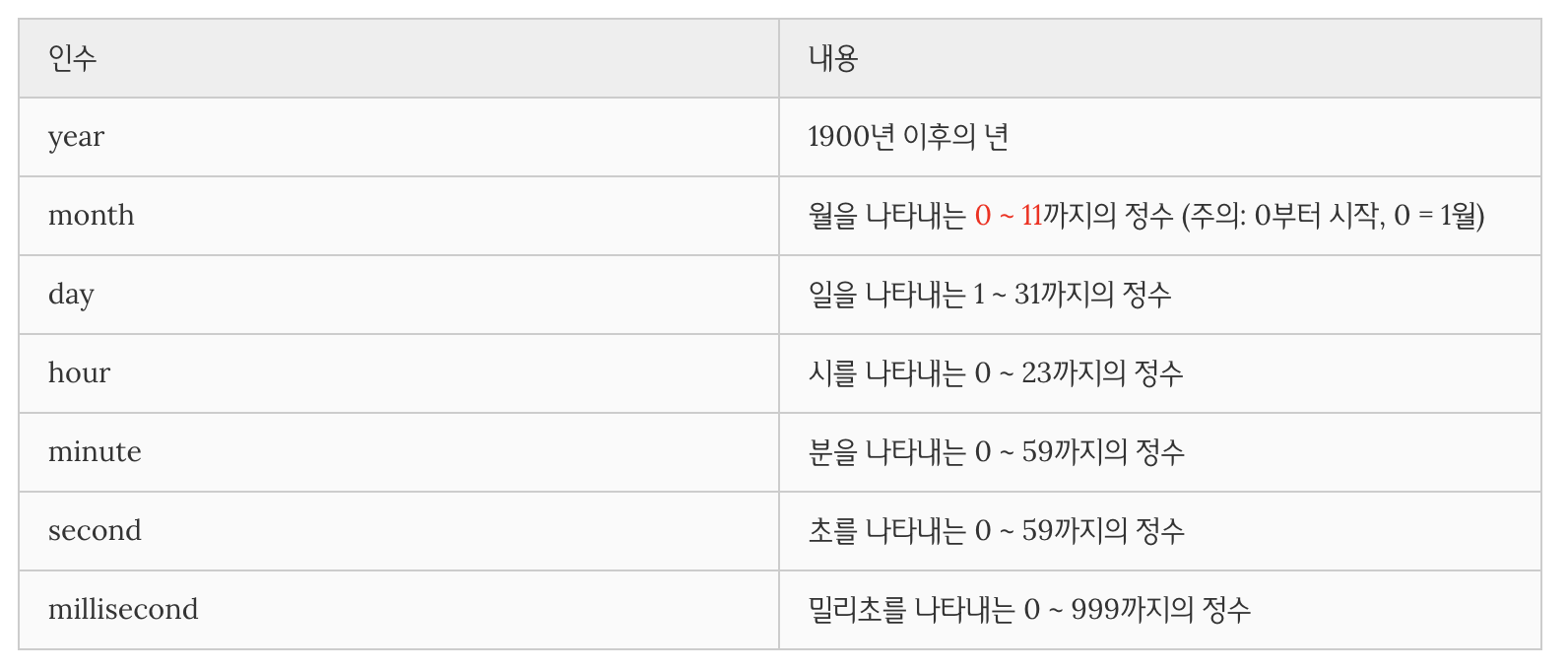 인수로 년, 월, 일, 시, 분, 초, 밀리초를 의미하는 숫자를 전달하면 지정된 날짜와 시간을 가지는 인스턴스를 반환한다.