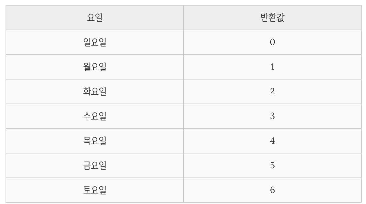 // getDay: 해당 요일(0 ~ 6)를 나타내는 정수를 반환한다.