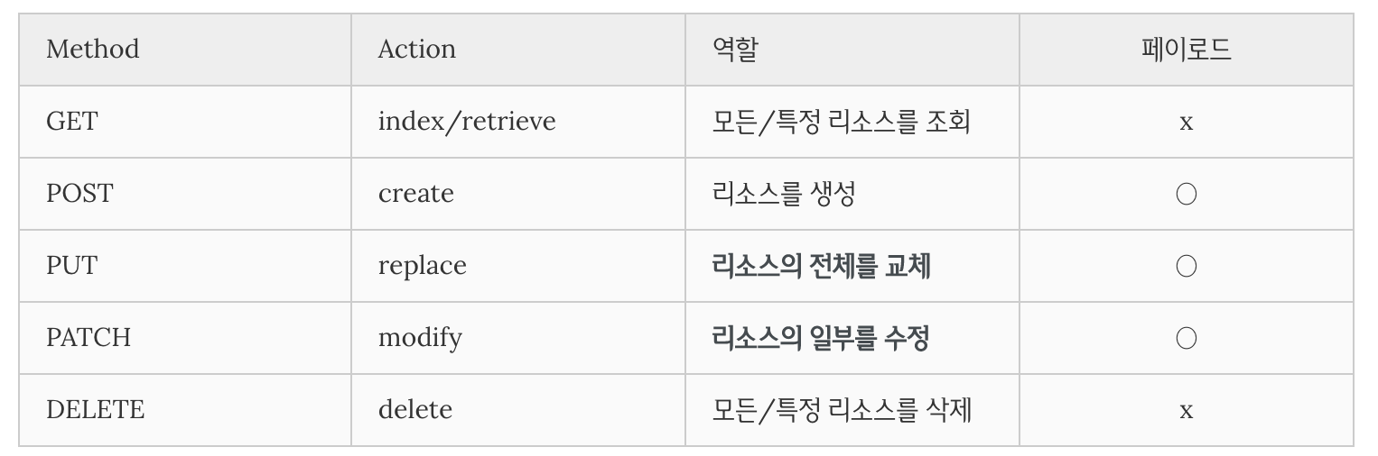 URI는 자원을 표현하는 데에 집중하고 행위에 대한 정의는 HTTP Method를 통해 하는 것이 REST한 API를 설계하는 중심 규칙이다.