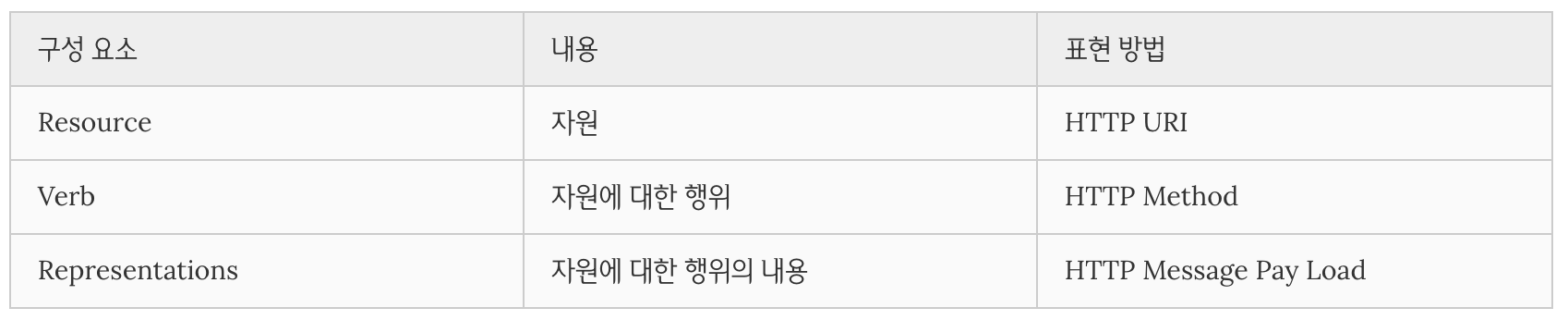 - 자원(Resource), 행위(Verb), 표현(Representations) 3가지의 요소로 구성