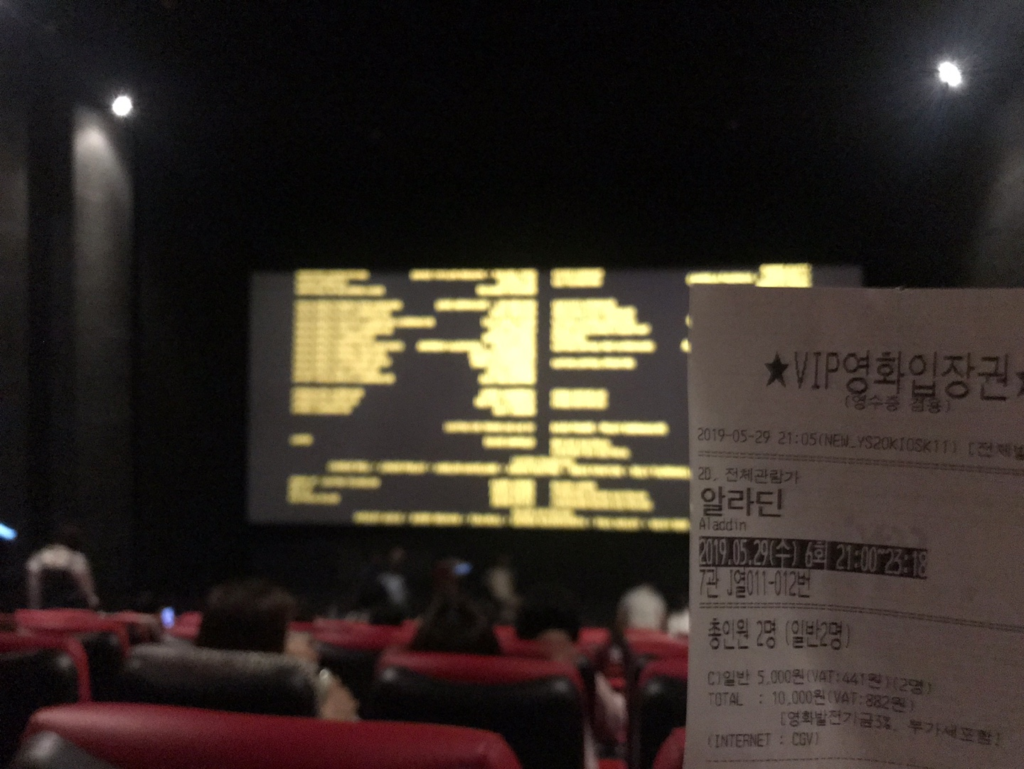 그러다가 2019.05.29<문화의 날> 기념 친구와 용산CGV에 가서 디즈니의 <알라딘>을 보고 왔습니다.