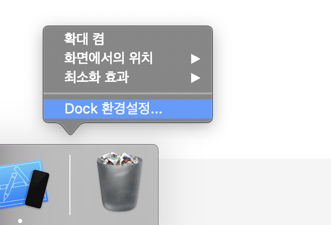 이렇게 휴지통 약간 옆에서 마우스 오른쪽 마우스를 누르면 dock 환경설정이 나옵니다.