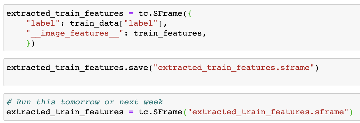 Here, you’re just combining the features of each image with its respective label into a new SFrame. This is worth saving for later use! Enter and run this code statement: