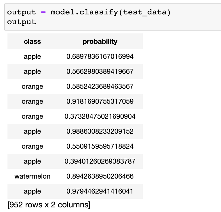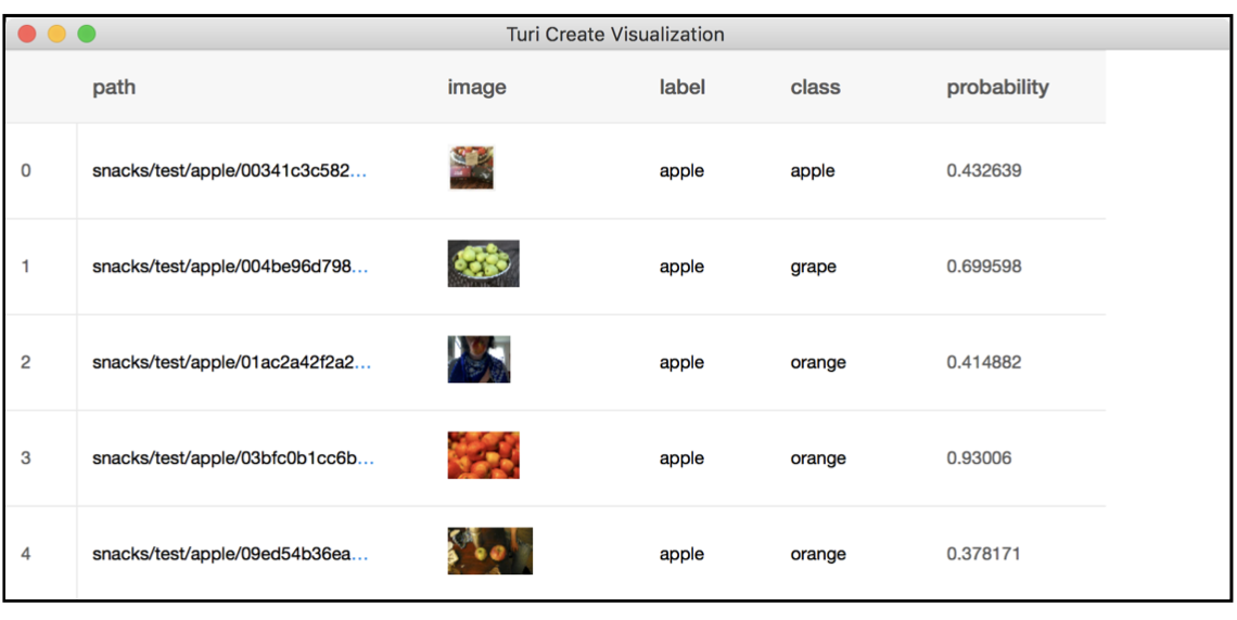 Turi Create’s predict() method can also give you the probability distribution for each image.