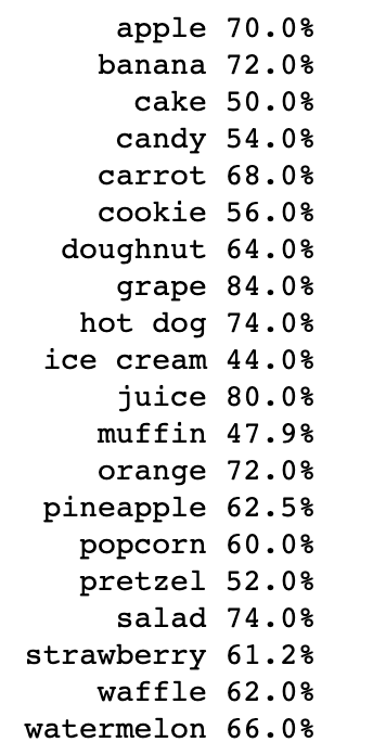 worst performing란 44% ice cream, 47.9% muffin 등이다. 모델을 improve하기 위해서는 이러한 클레스에 관심을 가져야 한다.