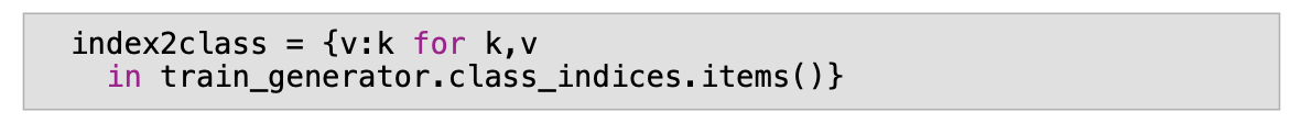 This is a so-called Python dictionary comprehension. It takes all the key-value pairs in the class_indices dictionary and creates a new dictionary that flips the order of the key and value. Now you can look up the name of the class by the index of the element that is 1 in the one-hot encoded vector for the label.