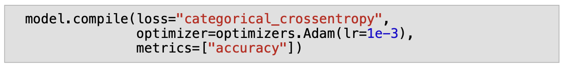 It’s important to choose a loss function that makes sense for your model. Because your model uses softmax to produce the final output, the corresponding loss function is the categorical cross-entropy. That sounds nasty, but categorical just means you’re building a classifier with more than two classes, and cross-entropy is the loss that belongs with softmax. For a classifier with two classes, you’d use binary cross-entropy loss instead.