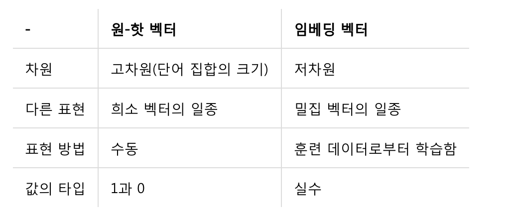 : 단어를 밀집 벡터의 형태로 표현하는 방법. 이 밀집 벡터를 워드 임베딩 과정을 통해 나온 결과라고 하여 임베딩 벡터(embedding vector)라고 함