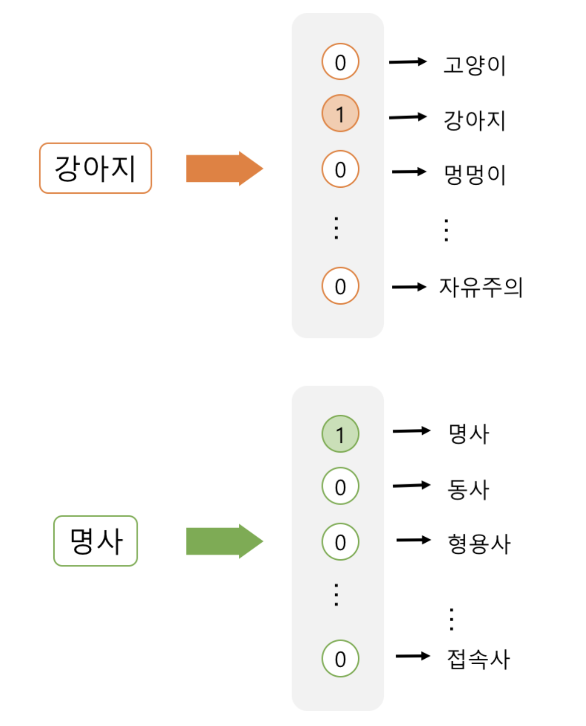 : 해당 속성이 가질 수 있는 모든 경우의 수를 각각의 독립적인 차원으로 표현한다. 가진 단어가 총 N개라면 이 속성이 가질 수 있는 경우의 수는 총 N개이다. One-hot encoding에서는 이 속성을 표현하기 위해 N차원의 벡터를 만든다. 그리고 해당하는 요소만 1이고 나머지는 모두 0으로 둔다. 이런 식으로 단어가 가질 수 있는 N개의 모든 경우의 수를 표현할 수 있다.