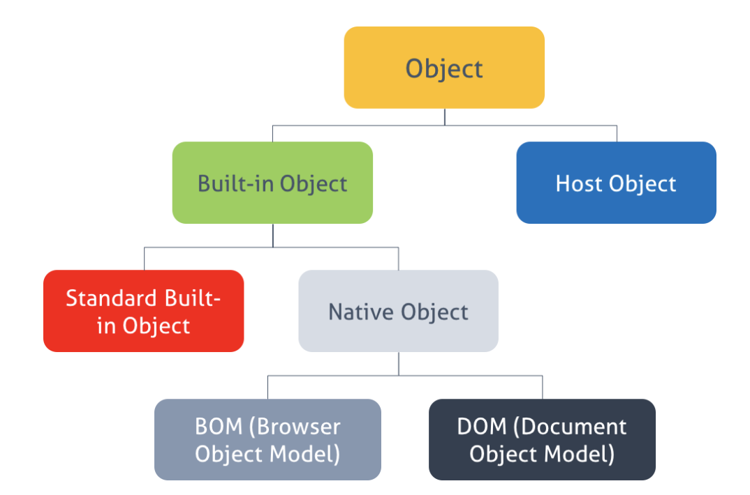 Standard Built-in Objects(표준 빌트인 객체)를 제외한 BOM과 DOM을 Native Object라고 분류하기도 한다. 또한 사용자가 생성한 객체를 Host Object(사용자 정의 객체)라 한다.